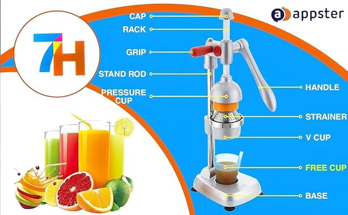• Easy Hand Press Operation – Effortlessly squeeze oranges, lemons, limes, pomegranates, and other fruits with a simple hand press; no electricity required.