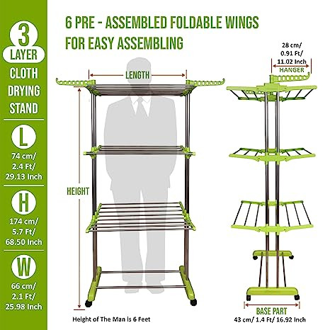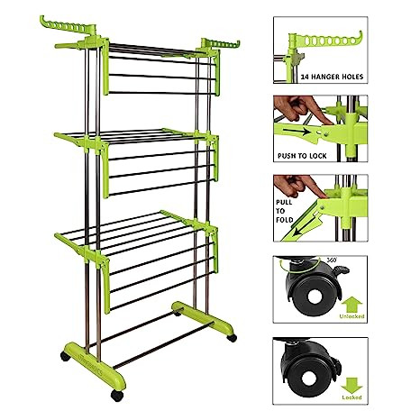LIVINGBASICS 3 Layer Finest Clothes Stand for Drying/Cloth Drying Stand/Cloth Stand for Drying Clothes Foldable/Cloth Drying Stand for Balcony/Stainless Steel Hanging Dress Dryer Rack (Green)